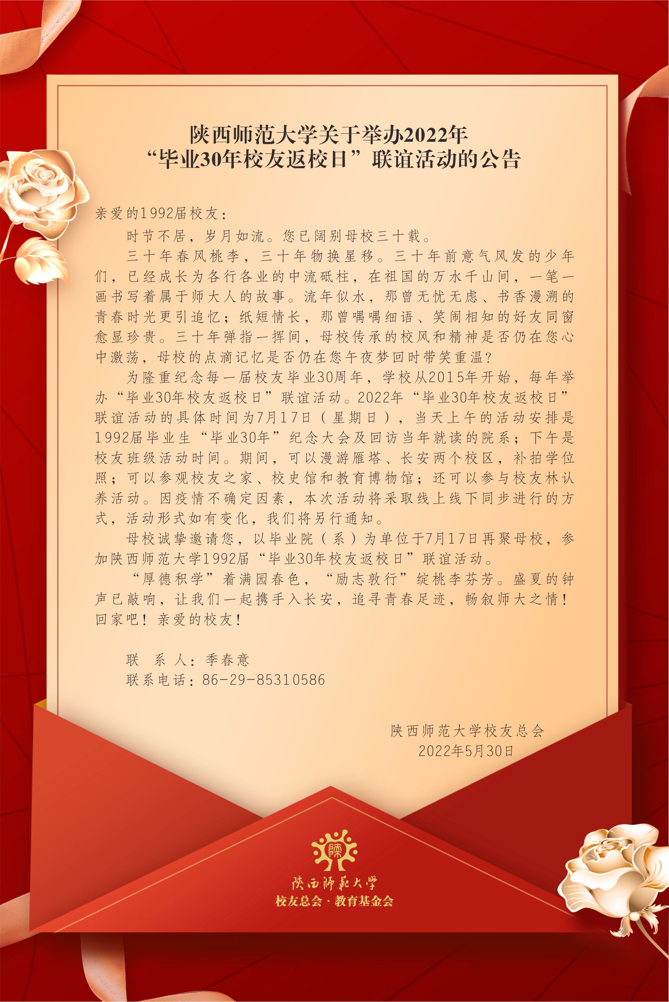 陜西師范大學關于舉辦2022年“畢業30年校友返校日”聯誼活動的公告