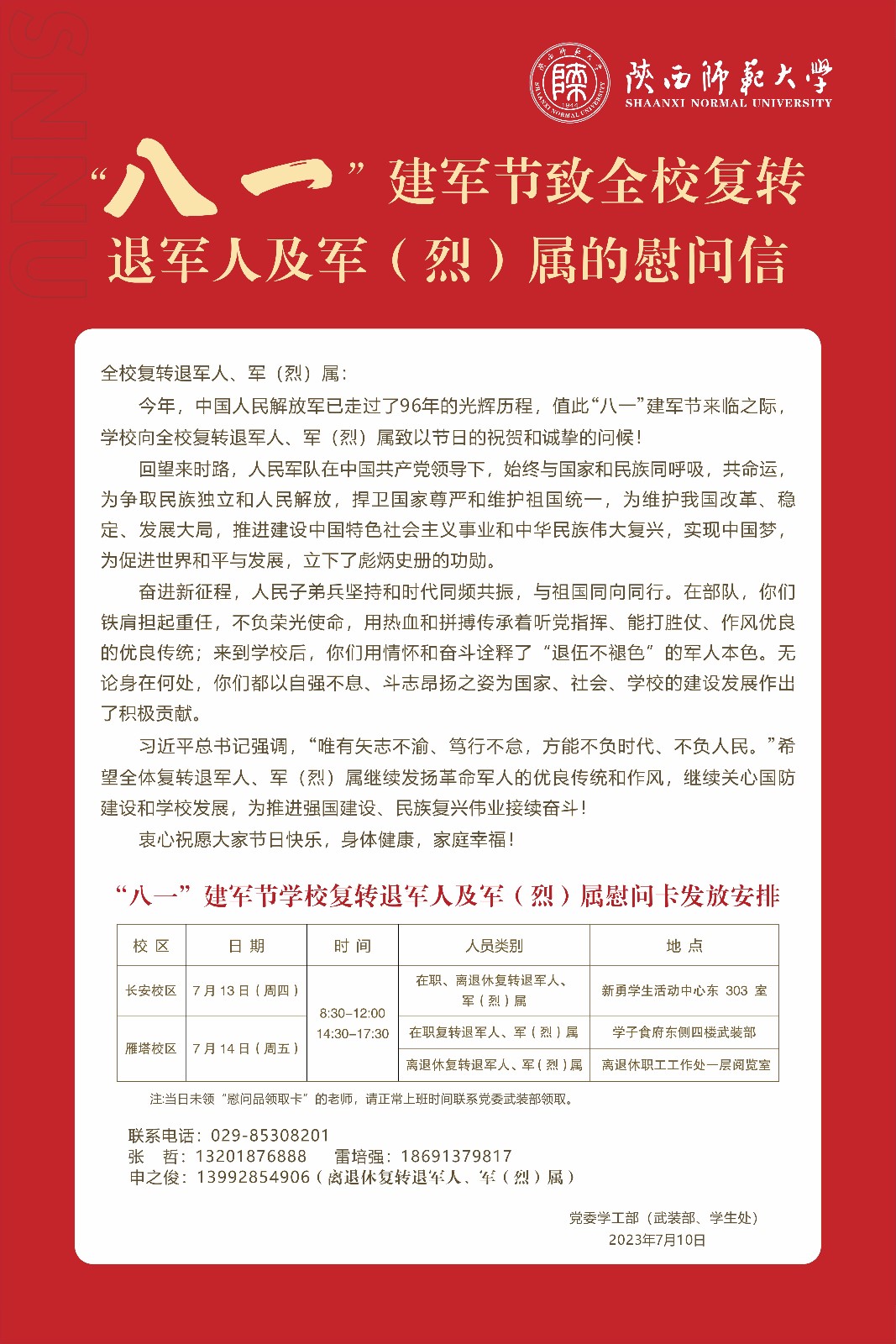 “八一”建軍節致全校復轉退軍人及軍(烈)屬的慰問信