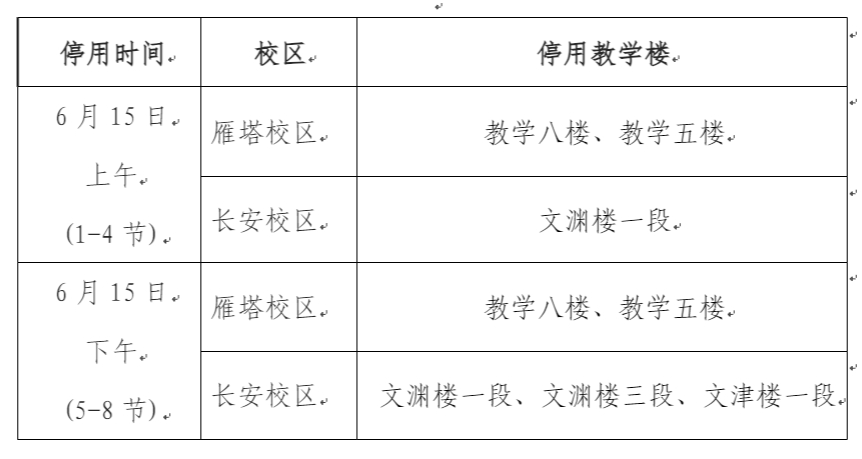 為保障考生有個良好的考試環境,屆時將對相關教學樓進行封閉式管理,所涉及教室全部停課。請各學院(部)及相關任課教師根據課程教學需要安排補課,其他需要該部分教室進行的活動全部停止。