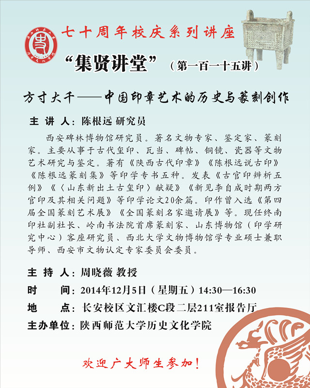 講座題目:70周年校慶系列學術講座之集賢講堂115講:方寸大千——中國印章藝術的歷史與篆刻創作